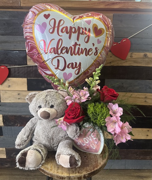This Valentine's Day arrangement also includes a large bear and a Valentine's Day balloon